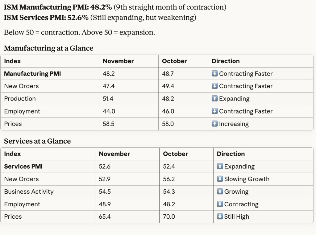 An uneventful week on Wall Street but we did get ISM services/manufacturing surveys and consumer credit data that demands attention as we turn towards 2026. The ISM (Institute for Supply Management) reports are monthly surveys of business conditions that serve as leading economic indicators and are closely monitored by investors.