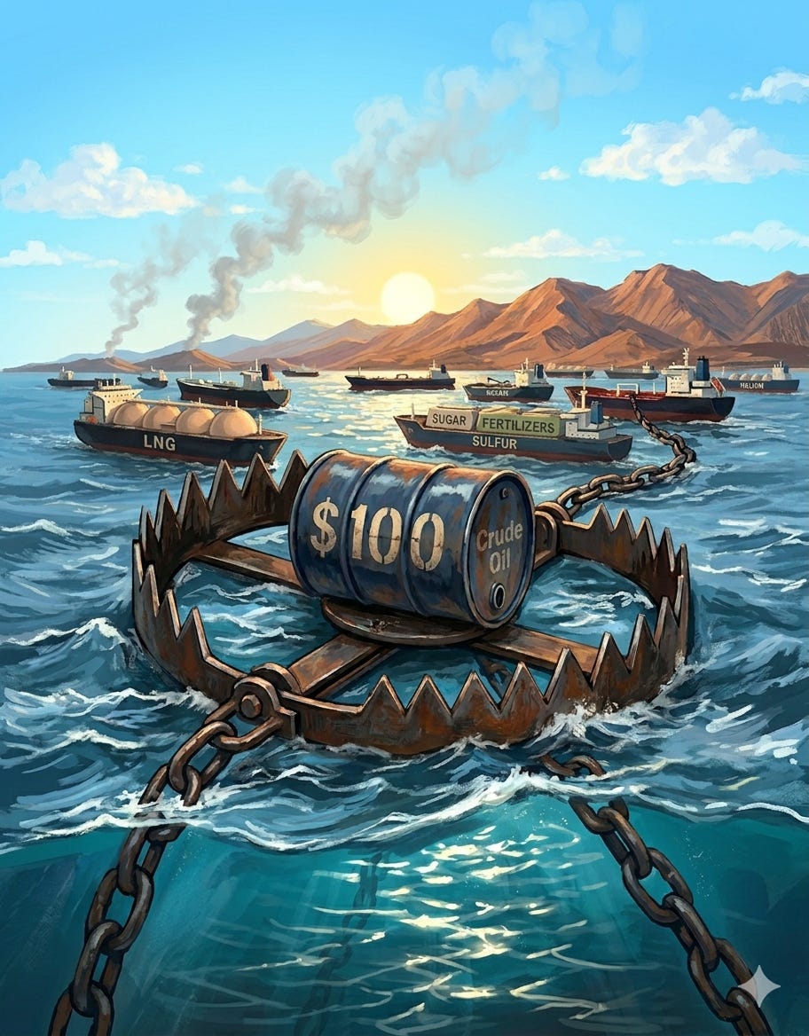 The Bottom Line: A Hormuz closure isn’t just an oil shock—it’s a fertilizer shock, an LNG shock, a sugar shock, and an industrial materials shock all at once. The second-order effects on food prices, manufacturing supply chains, and technology inputs could be just as significant as the headline crude price move.