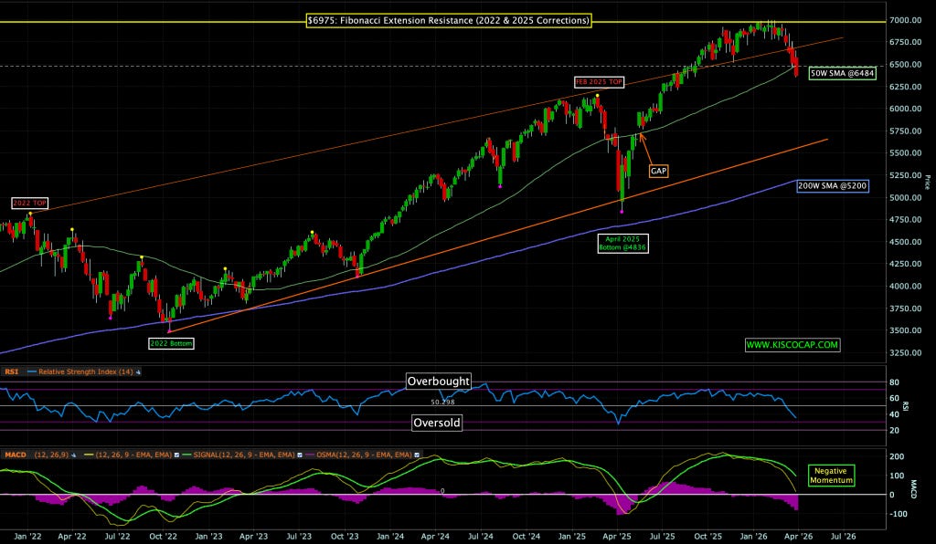 If you have been following the chart below since last summer, the 7000 level was identified as technical resistance which now looks like a top. Prices moved steadily lower into the close on Friday as it seems the market is now beginning to price in a protracted Iran conflict. A lot of oversold readings so we could develop a bounce if there are positive headlines by Monday but momentum is beginning to accelerate to the downside.