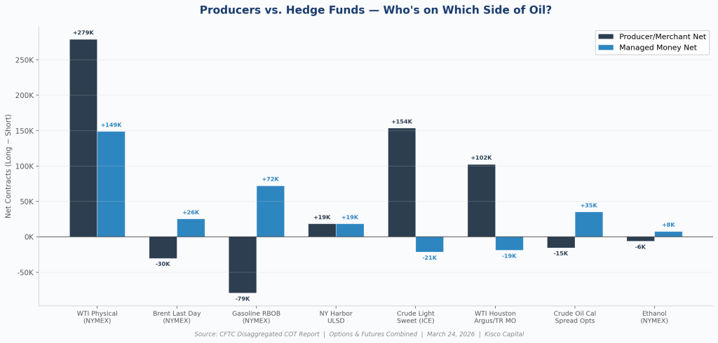 The chart above breaks down net positioning across eight key petroleum contracts, comparing where oil producers stand versus where hedge funds are placing their bets. The most striking feature is WTI Physical, where both producers and hedge funds are net long — producers by +279K contracts and managed money by +149K. That’s notable because producers typically sell futures to hedge their output, so a large net long position suggests they may be repositioning or that the contract’s composition includes significant refiner activity on the buy side.